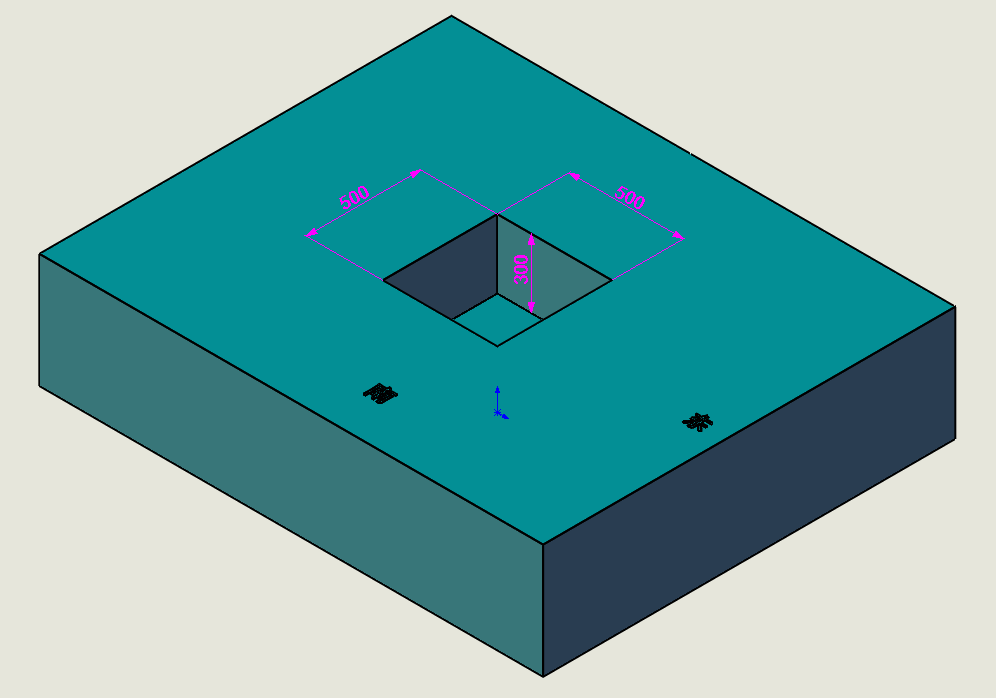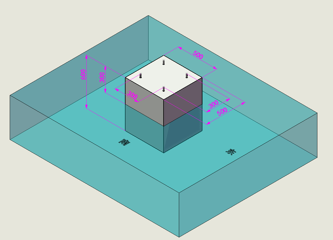 3、按下圖澆筑混凝土地基,外形尺寸(長(zhǎng)X寬X高)=50CM*50CM*60CM,露出地面高度30CM,預(yù)埋四顆M12*120mm鐵膨脹螺栓,螺栓露出地基高度30mm左右,中心距300X300mm,需保持螺栓垂直,不能有歪斜情況。