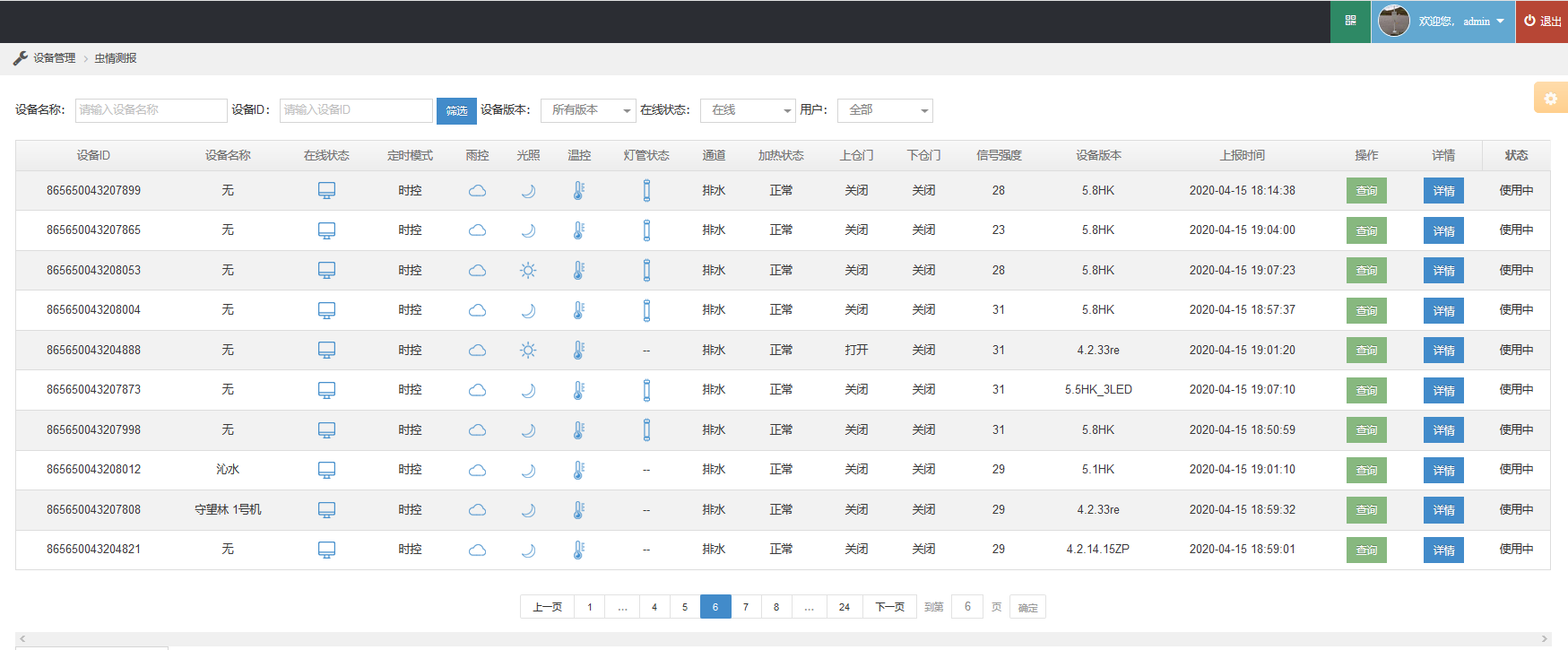 2、可以實時查看設(shè)備的定時模式、光控、雨控、溫控、落蟲、加熱、倉門開啟、信號強(qiáng)度、流量使用情況等工作狀態(tài)信息,能夠準(zhǔn)確的了解設(shè)備的實時的工作情況,可對設(shè)備出現(xiàn)的故障進(jìn)行研判、分析、和預(yù)警。