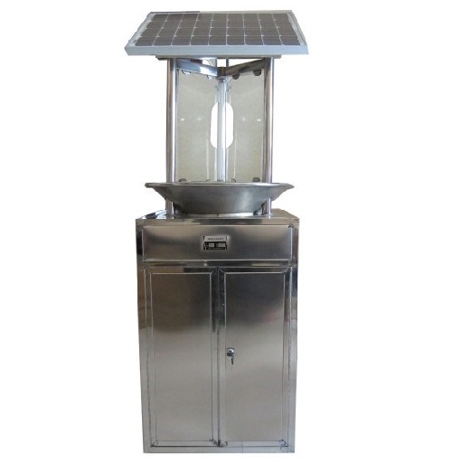 柜體式太陽(yáng)能殺蟲燈跟測(cè)報(bào)燈的外形相似,其采用頻振誘控和藥熏殺蟲技術(shù),通過光源引誘害蟲撞擊玻璃屏,害蟲撞暈后自動(dòng)滑落到集蟲箱里,然后通過藥熏方式進(jìn)行殺蟲,三層濾網(wǎng)或三層抽斗分離蟲體,不僅可以殺蟲,也可以起到蟲情測(cè)報(bào)作用。